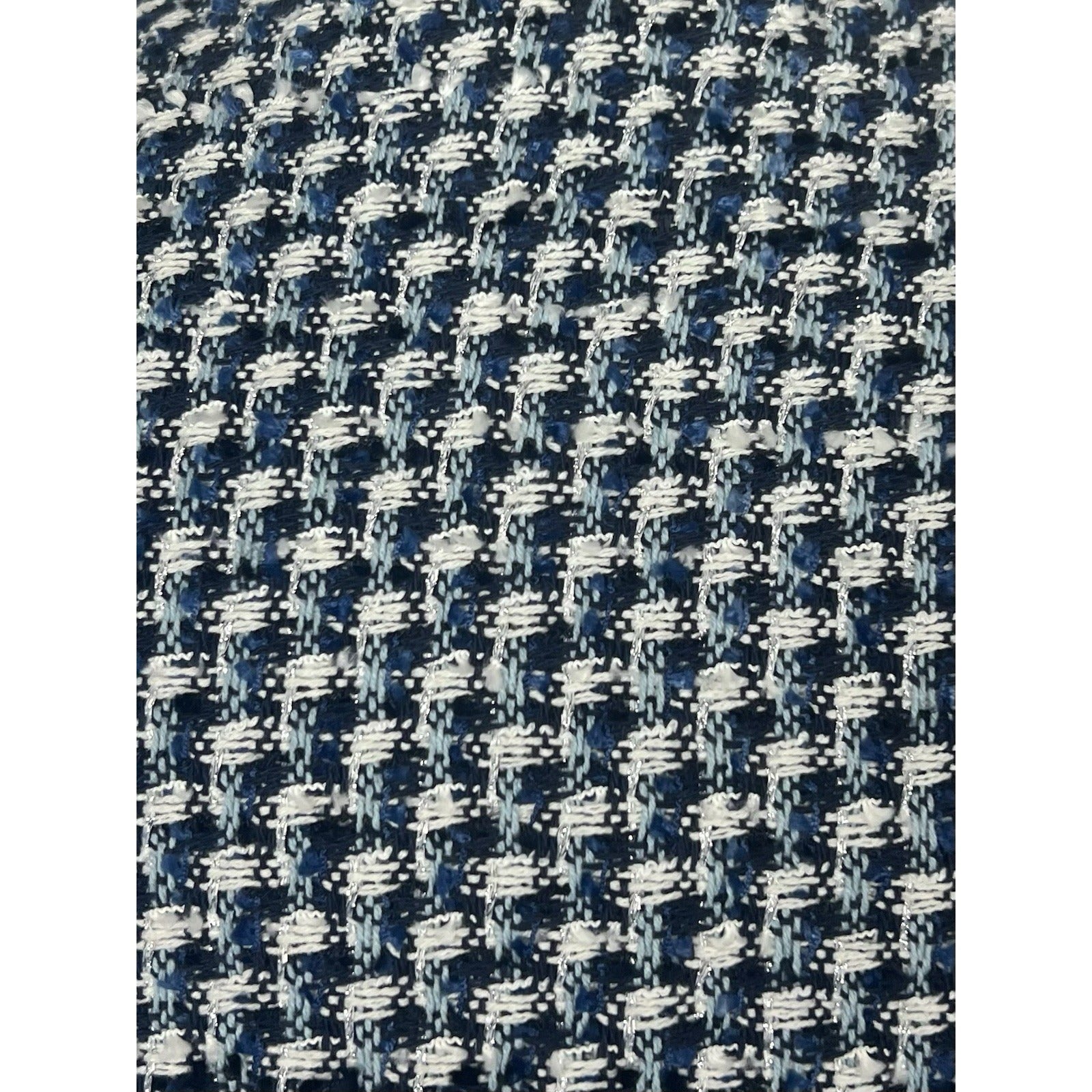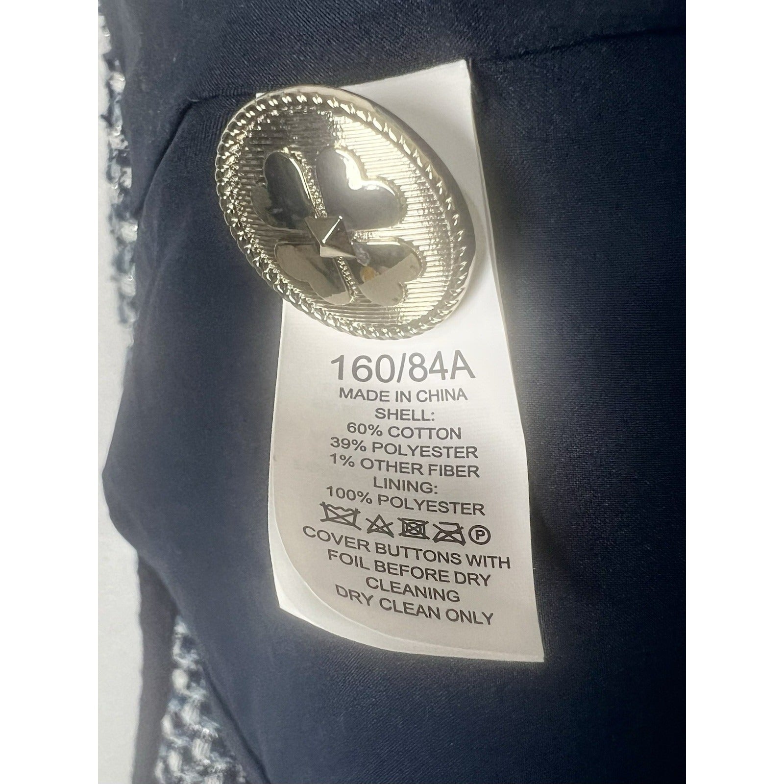 This is made of an elegant 80% cotton, 39% polyester, and one percent other material fibers in a very elegant, and stand out tweed type weave. The weave is done in shades of blues and white, and the blazer features navy blue piping trim as seen in the photos.