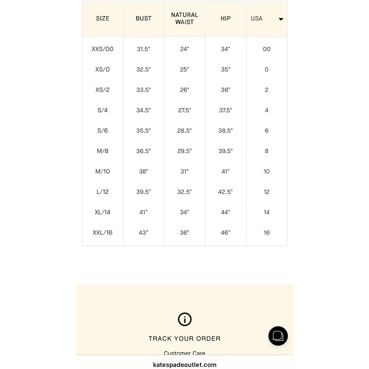 Size chart shows a size 2 fitting up to a 33.5 bust, 26 natural waist and a 26 hip.