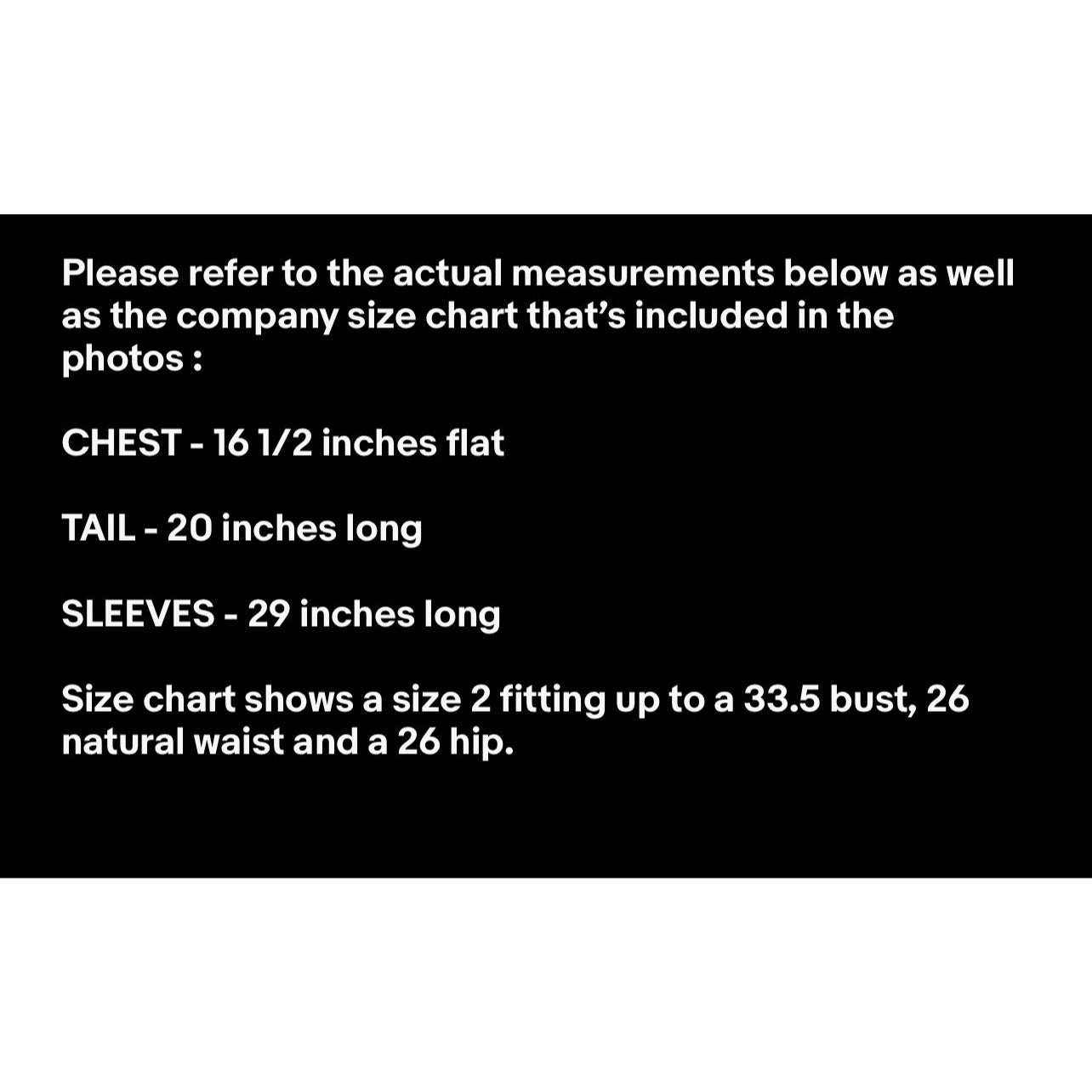 Please refer to the actual measurements below as well as the company size chart that’s included in the photos :